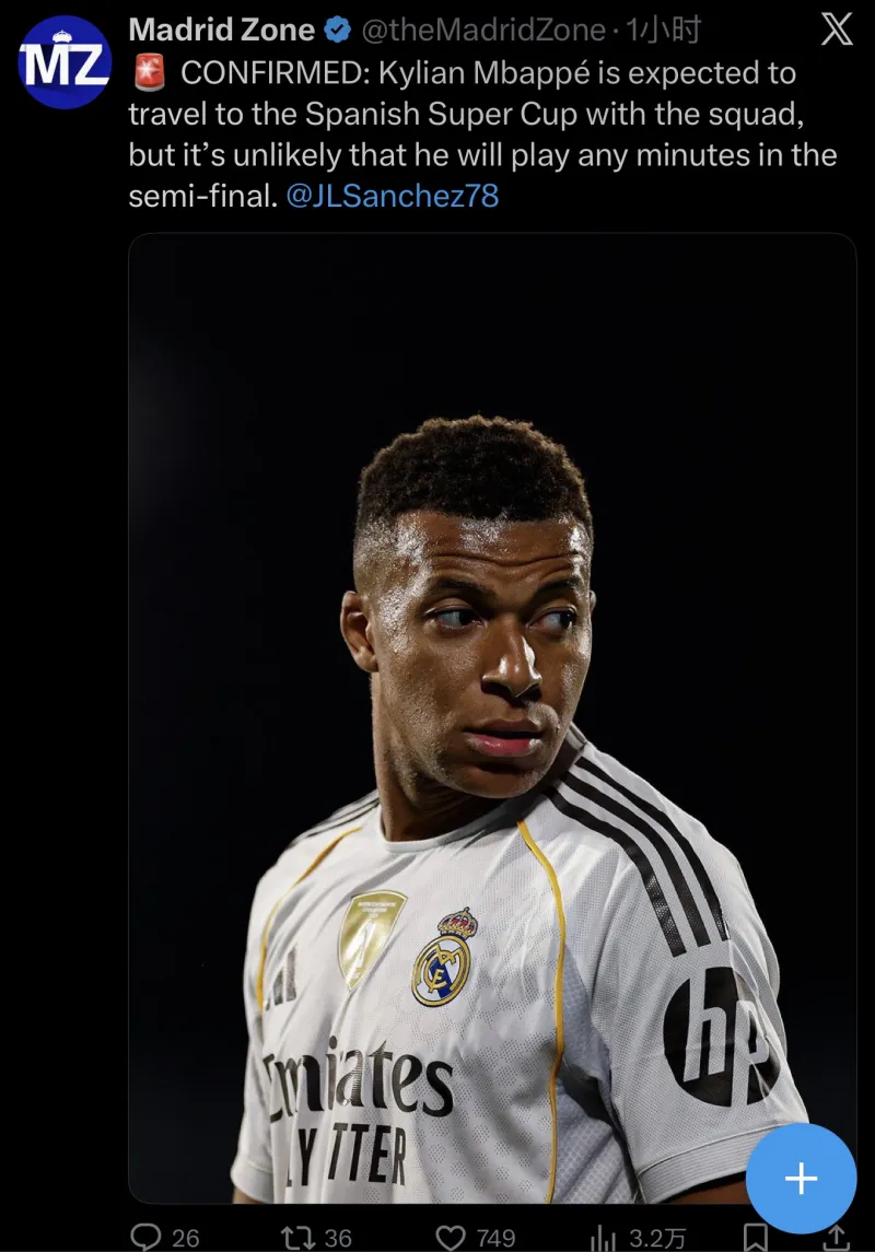 JLSanchez78:基利安·姆巴佩預(yù)計(jì)將隨隊(duì)出征西班牙超級杯,基計(jì)將級杯決賽但他不太可能在半決賽中登場。利安