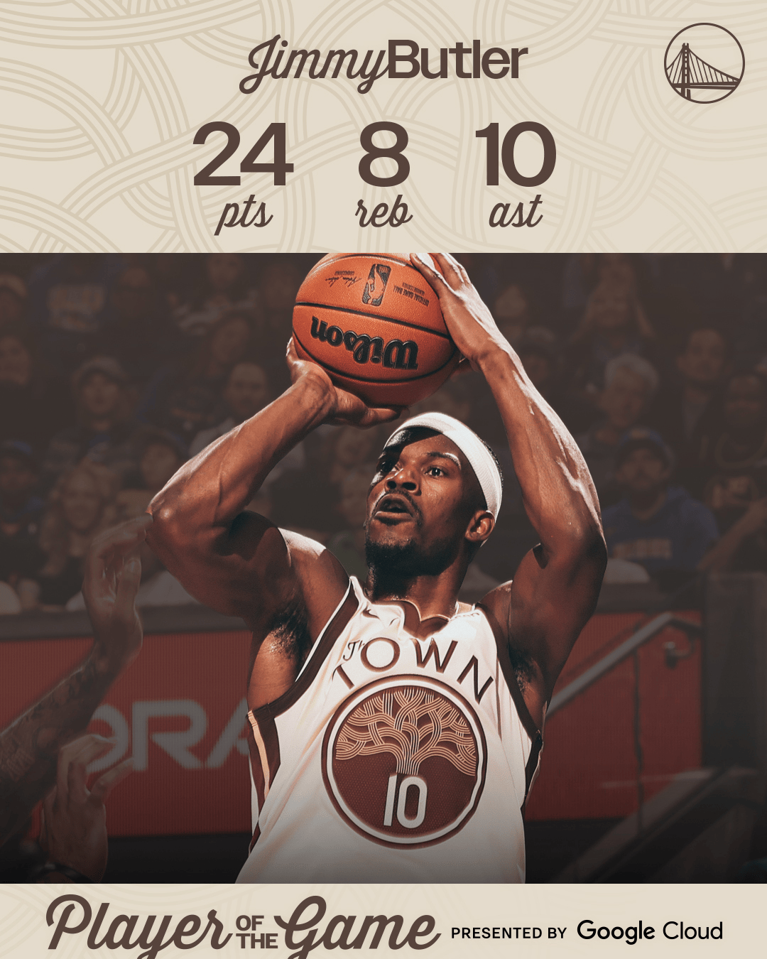 賽后,發(fā)分籃勇士官方發(fā)布巴特勒數(shù)據(jù)海報(bào),特勒全場(chǎng)砍下24分8籃板10助攻。海報(bào)