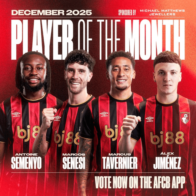 虎撲01月03日訊 伯恩茅斯官方公布了隊內(nèi)12月的最佳球員候選,被傳聞即將離隊的候選塞梅約出現(xiàn)在候選名單中。