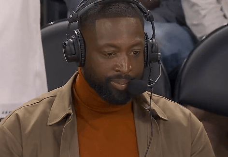 第四節(jié)比賽中,湖人和韋韋德現場解說湖人對陣獨行俠,對陣獨行德握詹姆斯和韋德握手致意。韋德