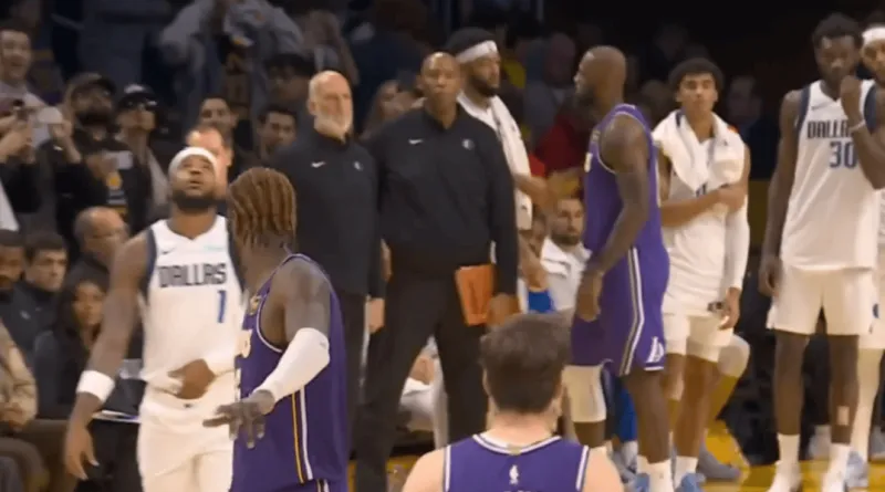 詹姆斯上場后,一把推開了站在湖人LOGO處的濃眉,然后還用屁股頂了下后者,并未與濃眉打招呼。