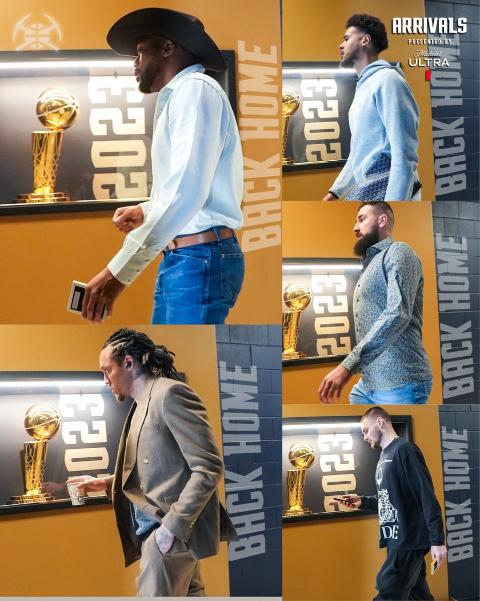 賽前,媒曬掘金社媒曬出球員步入場(chǎng)館的戈登瞬間,阿龍-戈登等球員出鏡,總冠照并配文: