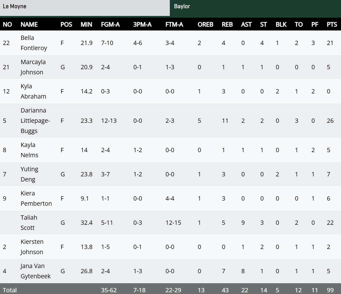 虎撲11月17日訊 今日NCAA女籃常規(guī)賽,貝勒大學99-43戰(zhàn)勝萊莫恩學院。鄧雨大學