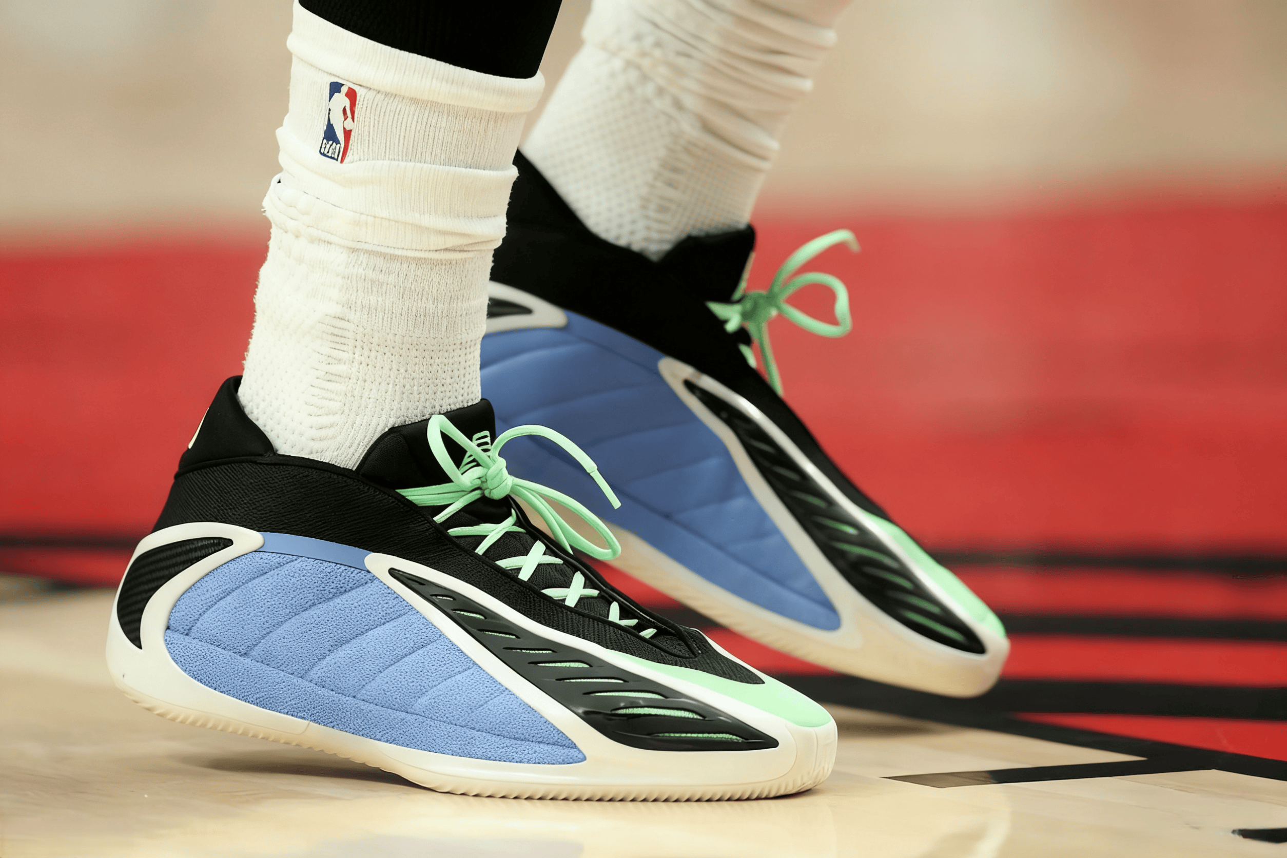 比賽中,愛德華茲上腳森林狼配色adidas AE2“Blue Burst”。