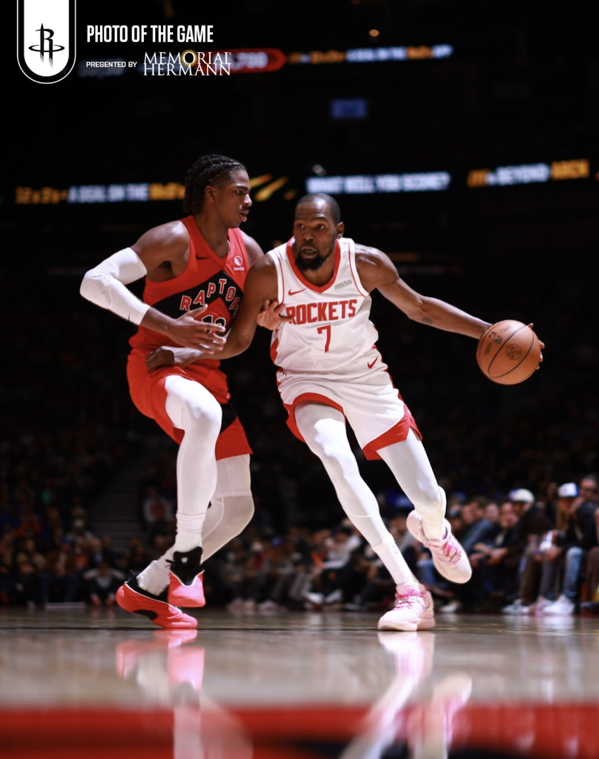 “杜蘭特和小史密斯合砍56分,對陣猛龍”,火箭官媒附文道。