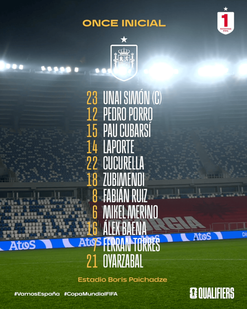 虎撲11月15日訊 北京時(shí)間11月16日凌晨1時(shí),2026年世界杯歐洲區(qū)預(yù)選賽E組第5輪,格魯吉亞和西班牙在鮑里斯-派恰澤迪納摩體育場(chǎng)展開對(duì)決。賽前,雙方公布了本場(chǎng)比賽的首發(fā)名單。