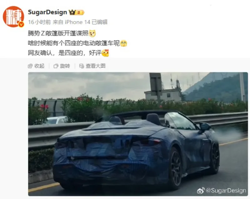 虎撲11月08日訊 博主 SugarDesign 曬出了一組比亞迪騰勢(shì) Z 雙門跑車敞篷版的實(shí)車諜照,展示了其“開蓬”形態(tài),并稱“網(wǎng)友確認(rèn),是四座的”。