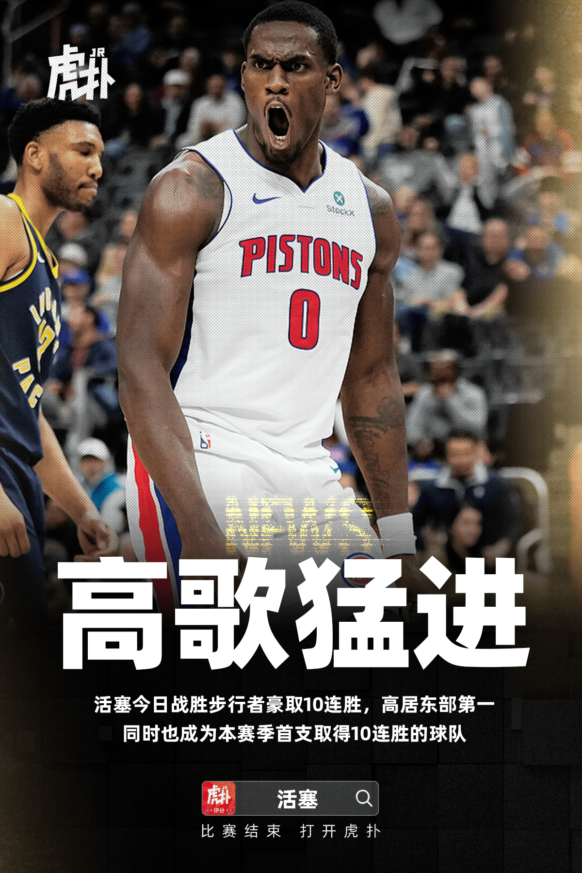 虎撲11月18日訊 今日NBA常規(guī)賽,活塞主場(chǎng)127-112戰(zhàn)勝步行者。塞戰(zhàn)勝步勝球