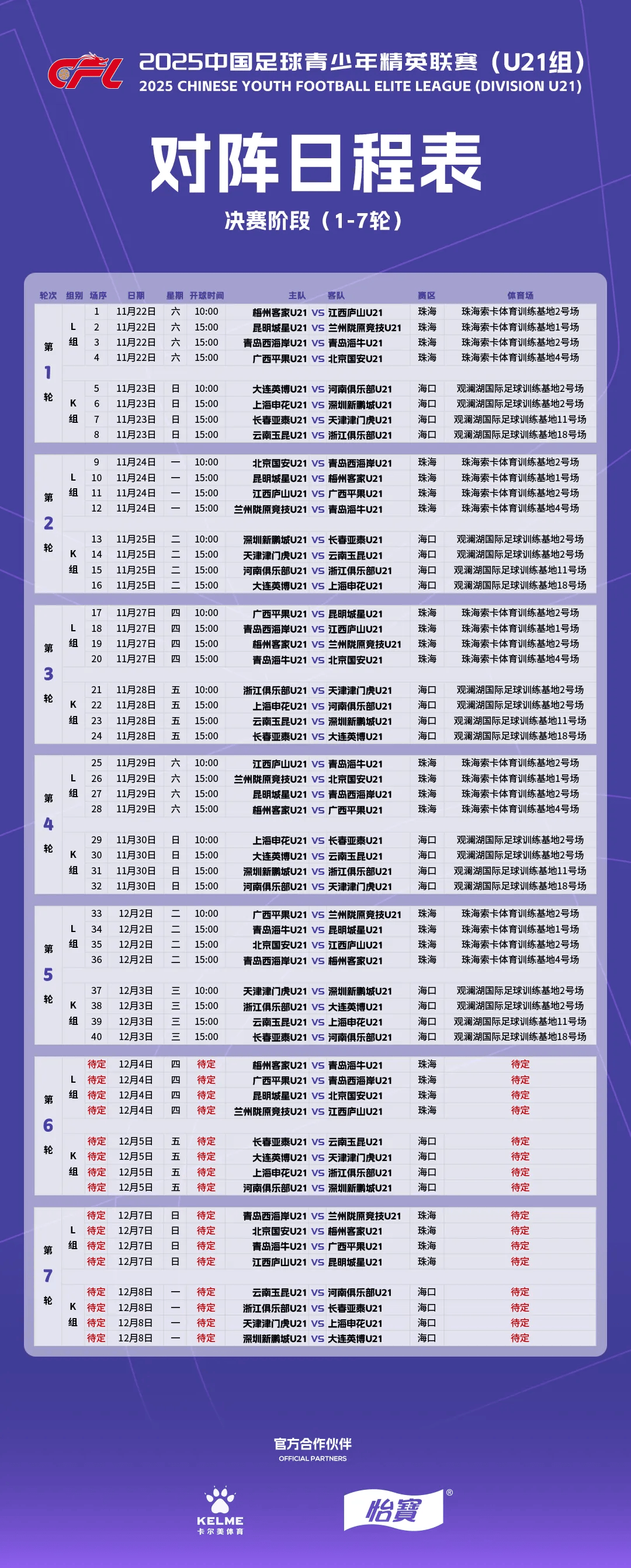 虎撲11月16日訊 2025中國(guó)足球青少年精英聯(lián)賽(U21組)決賽階段賽程將于11月22日至12月8日期間在珠海、??趦蓚€(gè)賽區(qū)進(jìn)行。流言聯(lián)賽